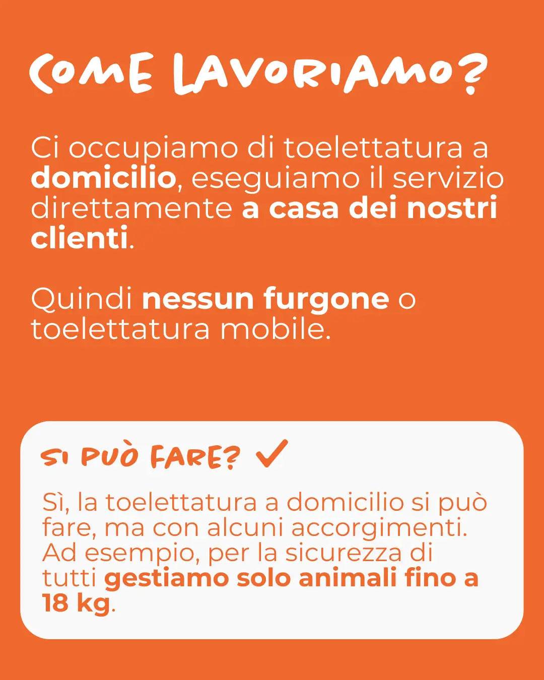 Per garantire la sicurezza del pelosetto e dei nostri professionisti, gestiamo a domicilio cani e gatti fino a 18 kg. Le taglie superiori le serviamo in uno dei nostri negozi.